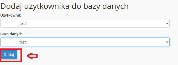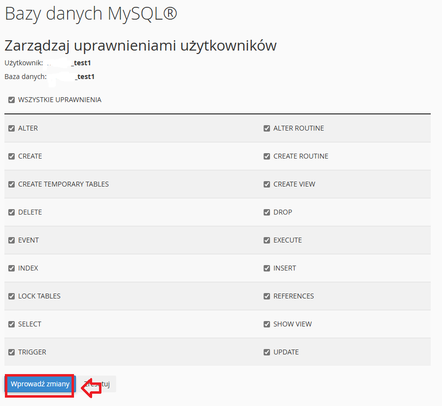 8. Dodaj użytkownika do utworzonej wcześniej bazy MySQL i zatwierdź dokonaną operację: