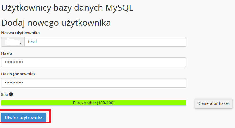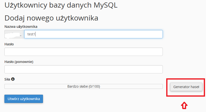 4. Analogicznie stwórz nazwę użytkownika bazy MySQL oraz hasło użytkownika, korzystając z generatora mocnych haseł po prawej stronie: